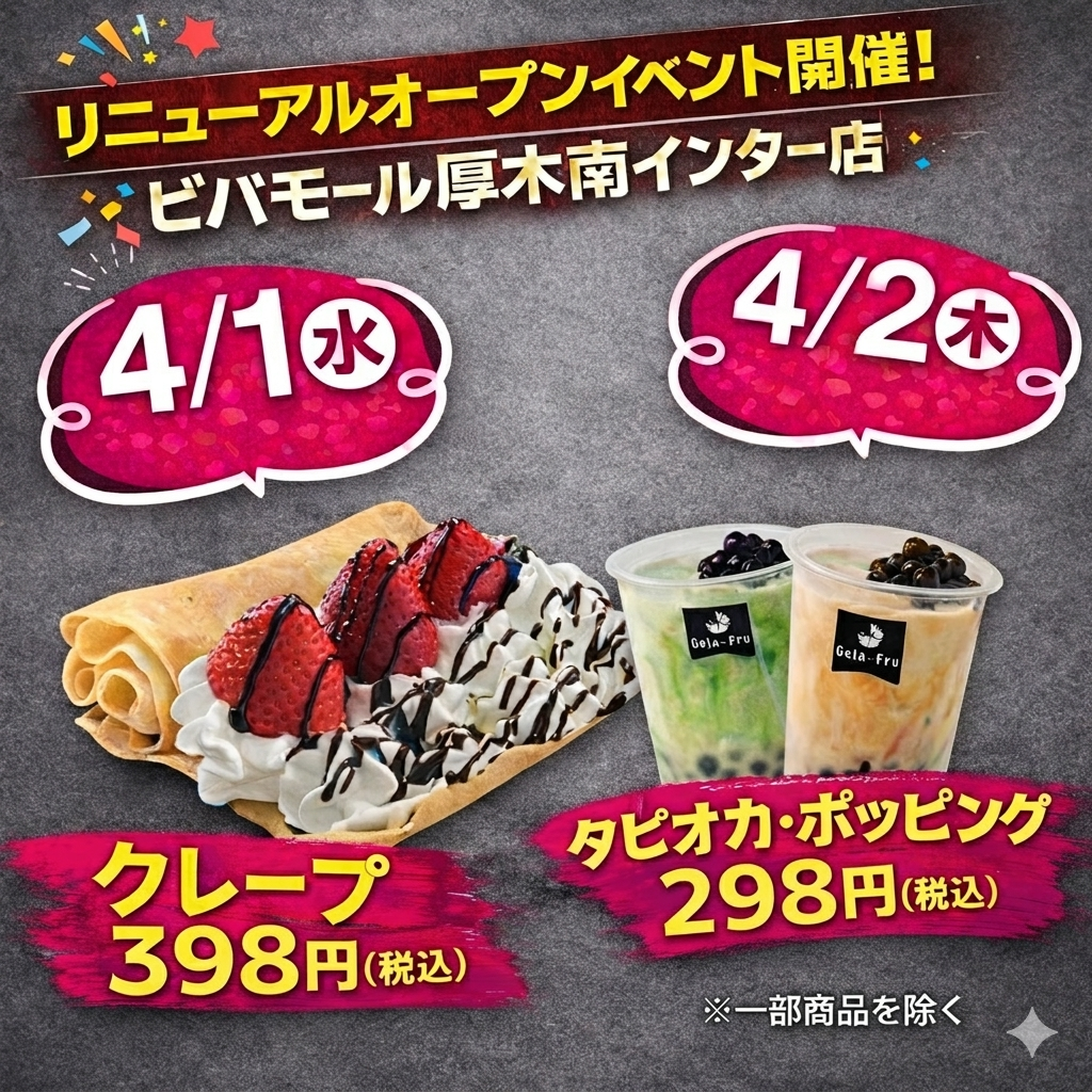 🎉ジェラフルビバモール厚木南インター店 リニューアルオープンのお知らせ🎉